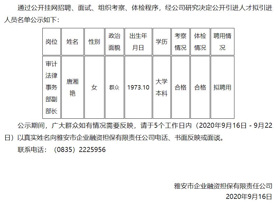 雅安市企業(yè)融資擔(dān)保有限責(zé)任公司公開引進(jìn)人才擬引進(jìn)人員名單公示